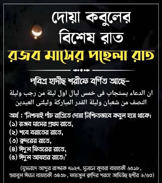হাদীছ শরীফ-এ আর ও ইরশাদ হয়েছে, “নিশ্চয়ই পাঁচ রাত্রিতে (বিশেষভাবে) দোয়া কবুল হয়।
