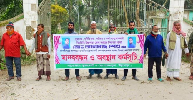 মানববন্ধনে ভুক্তভোগীরা জানান,ঘুষখোর, দুর্নীতিবাজ অনিয়ম ও অর্থ আত্মসাৎকারী আলমাছ হোসেন বিভিন্ন সময়ে সেচের লাইসেন্স পায়িয়ে দেওয়ার কথা বলে ৩০ জন কৃষকের কাছ থেকে প্রায় ১০ লাখ টাকা হাতিয়ে নিয়েছে। এতে করে গ্রাহকরা প্রতারণার শিকার হয়েছে। তাই এই দুর্নীতিবাজ আলমাছ হোসেনের চাকরি অপসারনের পাশাপাশি ভুক্তভোগীরা তাদের টাকা ফিরিয়ে পাওয়ার দাবি জানান।
