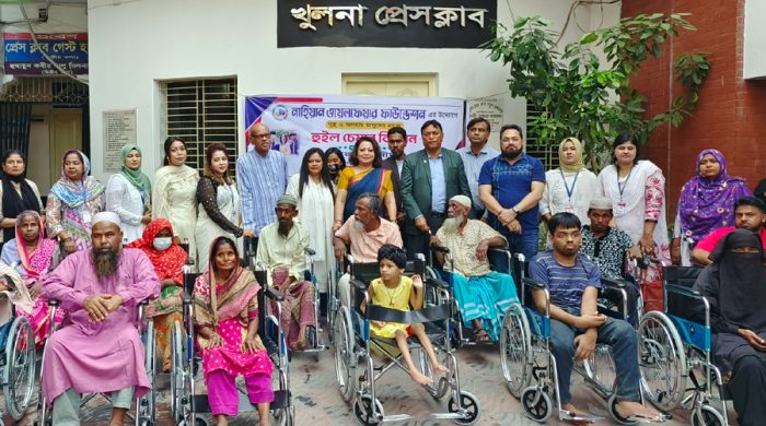 খুলনা প্রেসক্লাব চত্বরে প্রতিবন্ধীদের মাঝে হুইল চেয়ার বিতরণ