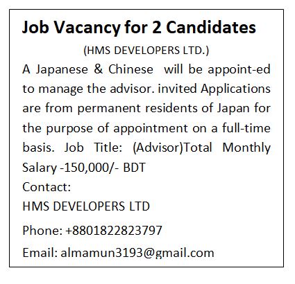 A Japanese & Chinese  will be appoint-ed to manage the advisor. invited Applications are from permanent residents of Japan for the purpose of appointment on a full-time basis. Job Title: (Advisor)Total Monthly Salary -150,000/- BDT