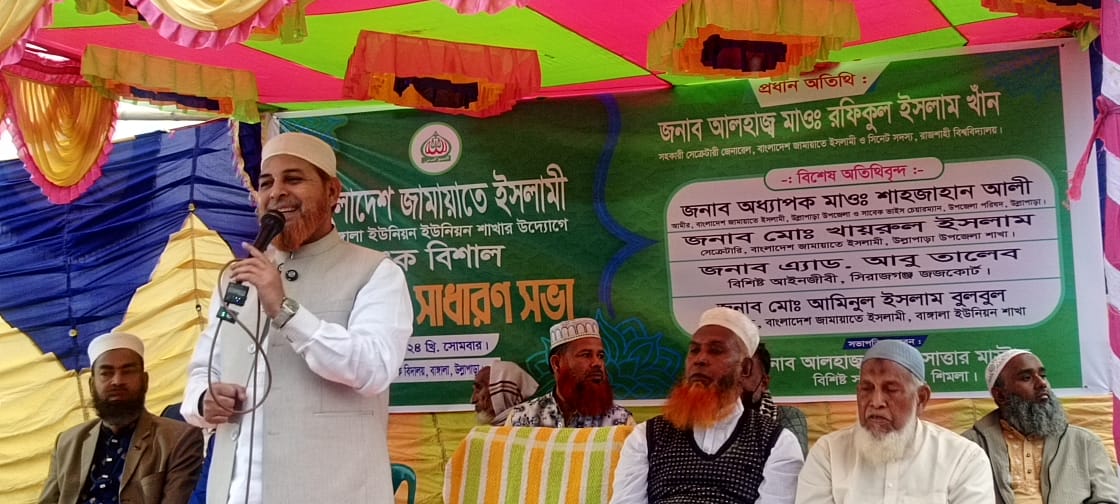 বাংলাদেশ জামায়াতে ইসলামীর কেন্দ্রীয় সহকারী সেক্রেটারি জেনারেল ও সিরাজগঞ্জ-৪ (উল্লাপাড়া-সলঙ্গা) আসনের জামায়াত মনোনিত সংসদ সদস্য প্রার্থী মাওলানা রফিকুল ইসলাম খান সোমবার (১ডিসেম্বর) বিকেলে সিরাজগঞ্জের উল্লাপাড়ার বাঙ্গালা ইউনিয়নের সিমলা প্রাথমিক বিদ্যালয় মাঠে বিশিষ্ট শিক্ষাবিদ আব্দুল সাত্তার মাষ্টারের সভাপতিত্বে এক নির্বাচনী সাধারণ সভায় প্রধান অতিথির বক্তব্যে এই কথাগুলো বলছিলেন।