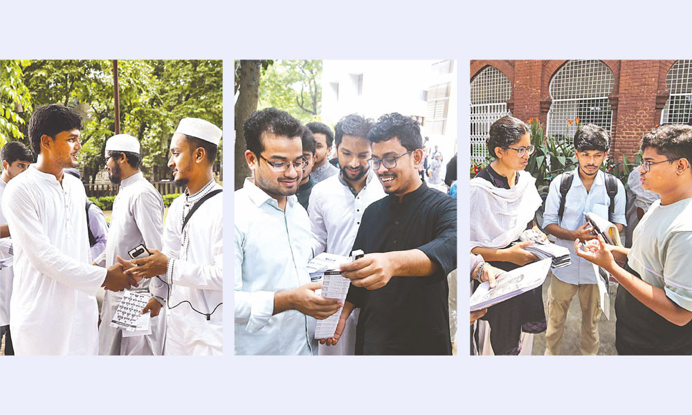 শপথ নিলেন ছাত্রদল মনোনীত প্রার্থীরা : ডাকসু নির্বাচনে জাতীয়তাবাদী ছাত্রদল সমর্থিত প্যানেলের প্রার্থীরা শপথ নিয়েছেন। নির্বাচিত হলে রাজনৈতিক শিষ্টাচার বজায় রাখা, পারস্পরিক শ্রদ্ধাবোধ তৈরি এবং প্রতিপক্ষের সঙ্গে গণতান্ত্রিক আচরণ করার অঙ্গীকার ব্যক্ত করে শপথ নেন তাঁরা। গতকাল রবিবার বিশ্ববিদ্যালয়ের কলা অনুষদের সামনের বটতলায় এই শপথ অনুষ্ঠান হয়। শপথবাক্য পাঠ করান ছাত্রদল মনোনীত সহসভাপতি (ভিপি) প্রার্থী মো. আবিদুল ইসলাম খান। এ সময় ডাকসু ও বিভিন্ন হল সংসদে ছাত্রদলের পূর্ণ প্যানেলের প্রার্থীরা উপস্থিত ছিলেন।