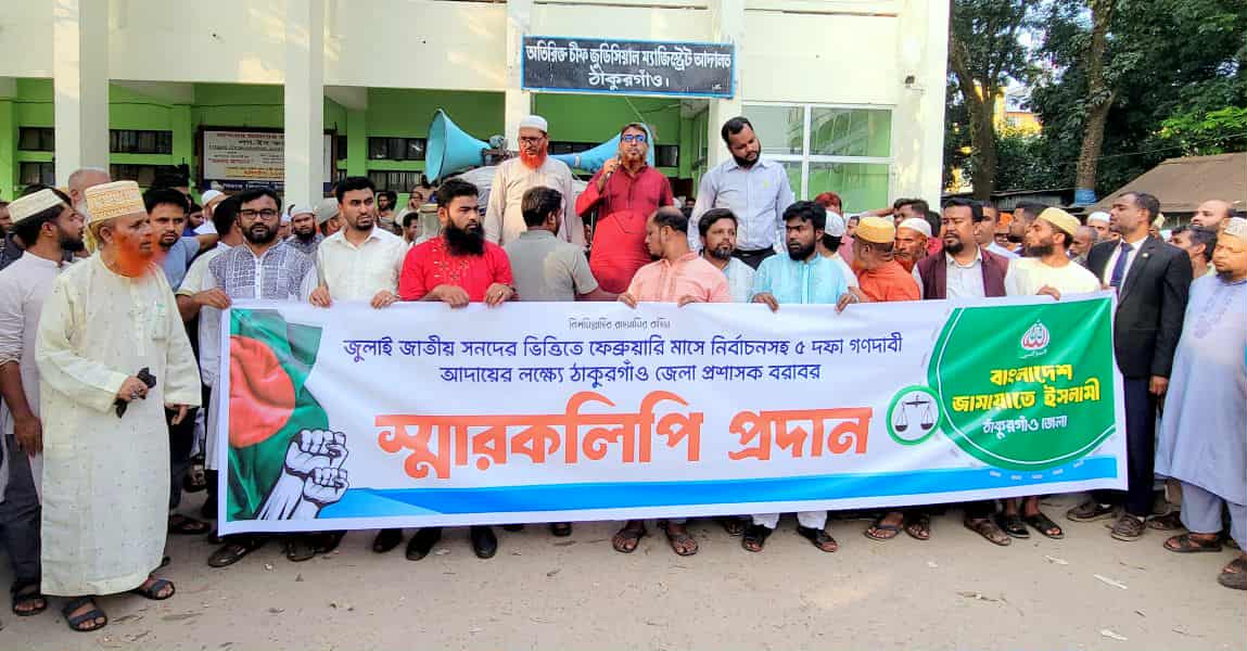 বাংলাদেশ জামায়াতে ইসলাম ঠাকুরগাঁও জেলা শাখার আয়োজনে রোববার বিকেলে ঠাকুরগাঁও পুরাতন বাসস্টান্ড থেকে একটি মিছিল বের হয়। মিছিলটি শহরের প্রধাণ সড়ক প্রদক্ষিণ করে জেলা প্রশাসক এর কার্যালয়ের সামনে গিয়ে শেষ হয়। সেখানে গণ সমাবেশে বক্তব্যের পর জেলা প্রশাসক ইশরাত ফারজানা বরাবর একটি স্মারকলিপি প্রদান করা হয়।