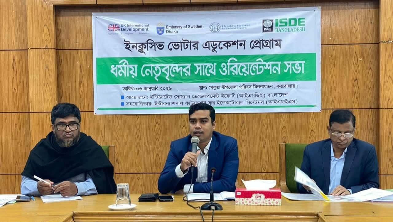 চট্টগ্রাম সংবাদদাতা।।আসন্ন জাতীয় সংসদ নির্বাচন–২০২৬ উপলক্ষে সকলের অংশগ্রহনে ভোটার অধিকার প্রয়োগ,নির্বাচন প্রক্রিয়া এবং অন্তর্ভুক্তিমূলক ও শান্তিপূর্ণ নির্বাচন অনুষ্ঠানে ধর্মীয় নেতৃবৃন্দের ভূমিকা সম্পর্কে সচেতনতা বৃদ্ধির লক্ষ্যে ৬ জানুয়ারী ২০২৬ইং তারিখ কক্সবাজারের পেকুয়ায়“ধর্মীয় নেতৃবৃন্দের সাথে ওরিয়েন্টেশন সভা”অনুষ্ঠিত হয়েছে।