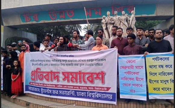 সংগঠনের যুগ্ম আহ্বায়ক ঢাবি শিক্ষার্থী মুহিউদ্দীন রাহাত বলেন, দ্বীপের প্রায় শতভাগ মানুষের জীবন-জীবিকার একমাত্র উপায় শীতকালের ৪ মাসের ভ্রমণশিল্প। সরকার পরিবশে রক্ষার নামে সেই চার মাসেই ভ্রমণের উপর বিধি নিষেধ আরোপ করেছে যেটা দ্বীপবাসীর প্রতি সরকারের অমানবিক সিদ্ধান্ত ও মৌলিক অধিকার হরণ। তাই, সব দিক বিবেচনায় আমরা নারিকেল দ্বীপের উপর আরোপিত সব ধরণের নিষেধাজ্ঞা তুলে দেয়ার দাবী জানাচ্ছি। অর্থাৎ সর্বপ্রকার নিষেধাজ্ঞা তুলে নিতে হবে।