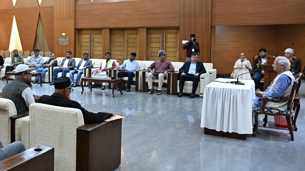 রাজনৈতিক নেতাদের উদ্দেশ্যে প্রধান উপদেষ্টা বলেন, ‘আপনাদের সঙ্গে দেখা হলে, বসতে পারলে খুব ভালো লাগে। মনে সাহস পাই। কারণটা পরিষ্কার, এই সরকারের জন্ম হয়েছে ঐক্যের মাঝখানে, ঐক্যের দ্বারা এটার সৃষ্টি। যখন আমরা নিজেরা নিজেরা কাজ করি, তখন দেখি একা পড়ে গেছি, আশেপাশে কেউ নেই। তখন একটু দুর্বল মনে হয়। যখন আবার সবাই একসঙ্গে কাজ করি, তখন মনের সাহস বাড়ে; আমরা তো একতাবদ্ধভাবে আছি। একতাতেই আমাদের জন্ম, একতাতেই আমাদের শক্তি।’