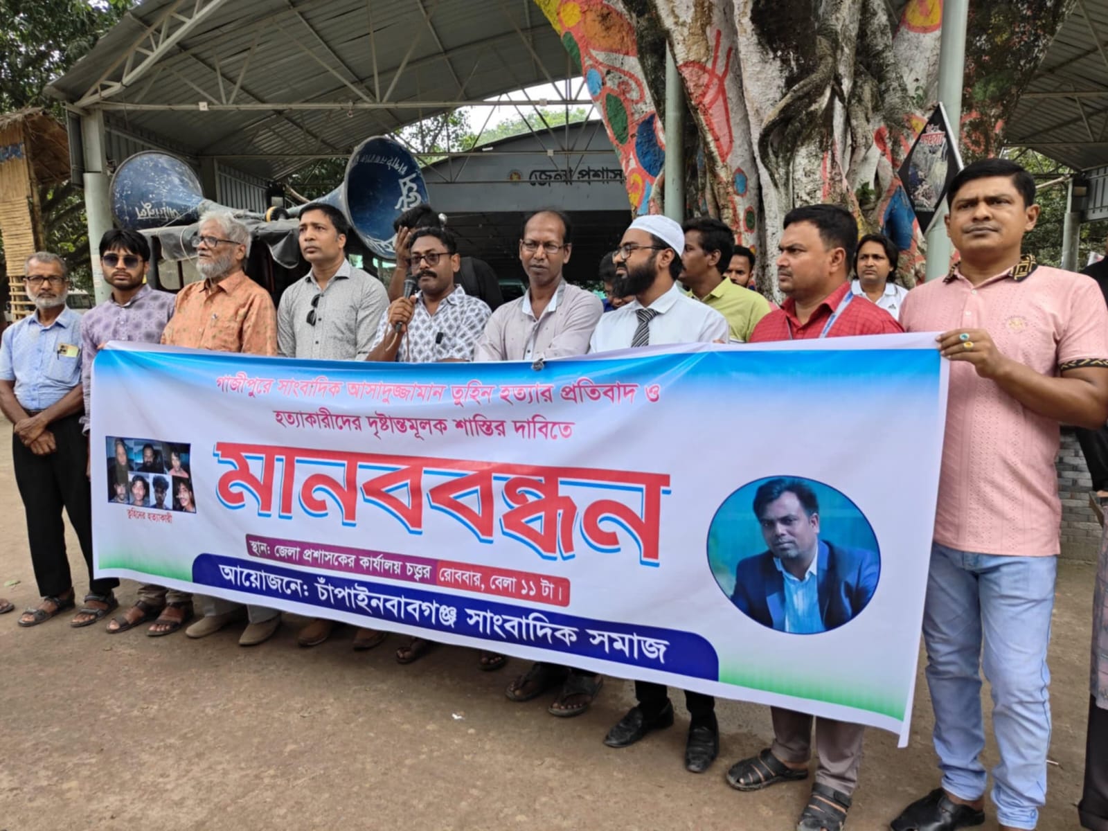গাজীপুরে চন্দনা চৌরাস্তায় প্রকাশ্যে মানুষের লোকালয়ে সাংবাদিক আসাদুজ্জামান তুহিনকে হত্যার প্রতিবাদ ও তীব্র নিন্দা জানিয়ে এবং হত্যাকারীদের গ্রেফতার ও দ্রুত দৃষ্টান্তমূলক শাস্তির দাবি জানিয়েছন চাঁপাইনবাবগঞ্জ সাংবাদিক বৃন্দরা । দেশীয় অস্ত্র নিয়ে এক যুবককে মারধর ও ধাওয়া দেওয়ার ঘটনা ভিডিও করায় গাজীপুরের সাংবাদিক মো.আসাদুজ্জামান তুহিনকে (৩৮)গত বৃহস্পতিবার (৭ আগস্ট) রাত ৮টার দিকে গাজীপুর মহানগরের চান্দনা চৌরাস্তা এলাকায় প্রকাশ্যে সাংবাদিক তুহিনকে কুপিয়ে হত্যা করা হয়। তিনি দৈনিক প্রতিদিনের কাগজ পত্রিকার সাংবাদিক। তুহিন ময়মনসিংহের ফুলবাড়িয়ার ভাটিপাড়া এলাকার হাসান জামালের ছেলে। চান্দনা চৌরাস্তা এলাকায় সপরিবারে বসবাস করতেন তিনি।