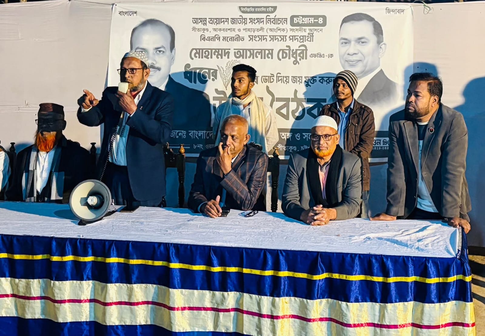 সীতাকুণ্ড( চট্টগ্রাম)প্রতিনিধি।।৫ ফেব্রুয়ারী বৃহস্পতিবার ৫ টায় চট্টগ্রাম জেলার সীতাকুণ্ড উপজেলার ৪ নং মুরাদপুর ইউনিয়নের ৮ নং ওয়ার্ড কমিটির আয়োজনে বৃহত্তর সাতঘরিয়া পাড়ার রাজা মিয়ার বাড়িতে বিএনপির মনোনীত প্রার্থী জননেতা আসলাম চৌধুরীর ধানের শীষ প্রতীকের সমর্থনে সকল গোষ্ঠীর মুরুব্বি,সমাজের সর্দারসহ সর্বসাধারণের সাথে ধানের শীষ কে বিজয় করার পরিকল্পনা বাস্তবায়নে এক উঠান বৈঠক অনুষ্ঠিত হয়েছে।এতে আসলাম চৌধুরীর পক্ষে উপস্হিত ছিলেন ইউনিয়ন ও ওয়ার্ড কমিটির নেত্রীবৃন্দ।ওয়ার্ড কমিটির আবু জাফর,জাহাঙ্গীর আলম কোম্পানি,মোস্তাফিজুর রহমান,মোঃ সাহেদ,মোঃ পিন্টু,সালা উদ্দিন ও কোরবান আলী প্রমূখ উপস্থিত ছিলেন।বক্তারা বলেন সীতাকুণ্ডের উন্নয়নে সৎ,যোগ্য ও মানবিক মানুষ আসলাম চৌধুরীর কোন বিকল্প নেই।আর এ উন্নয়নের প্রতীক হচ্ছে ধানের শীষ-আগামী ১২ ই ফেব্রুয়ারি সারাদিন