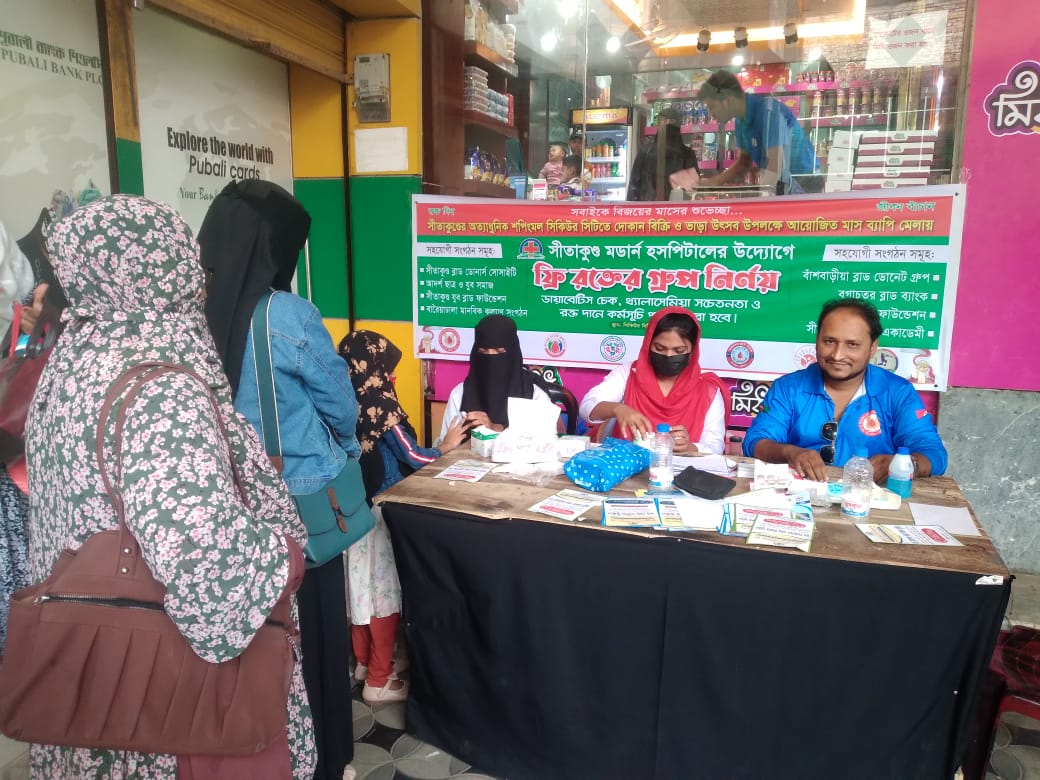 এ জেড ভূঁইয়া রাজু,সীতাকুন্ড।। চট্টগ্রাম জেলার সীতাকুণ্ডের প্রাণকেন্দ্রে অবস্হিত আধুনিক শপিংমল সিকিউরিটি সিটিতে দোকান বিক্রি ও ভাড়া উৎসব উপলক্ষে ১ ডিসেম্বর থেকে শুরু হওয়া মাসব্যাপী আয়োজিত মেলায় সীতাকুণ্ড মর্ডান হসপিটালের উদ্যোগে সীতাকুন্ডের ঊল্লেখযোগ্য ৮ টি মানবিক ও স্বেচ্ছাসেবী সংগঠন যথাক্রমে : সীতাকুণ্ড ব্লাড ডোনার্স সোসাইটি, আদর্শ ছাত্র যুব সমাজ,সীতাকুণ্ড যুব ব্লাড ফাউন্ডেশন,বারৈয়াঢালা মানবিক কল্যাণ ফাউন্ডেশন,সীতাকুণ্ড ক্রিকেট একাডেমি,মানবতা ফাউন্ডেশন, বগাচতর ব্লাড ব্যাংক ও বাঁশবাড়ীয়া ব্লাড ডোনেট গ্রুপ সংগঠন গুলির সমন্বয় ও স্বেচ্ছায় শ্রমের ভিত্তিতে পরিচালনায় আয়োজিত মেলায় আগত দর্শনার্থীদের জন্য চোখে পড়ার মত একটি স্টলে “ফ্রী রক্তের গ্রুপ নির্ণয়”ক্যাম্প চালু করেন।এছাড়াও এখানে ডায়াবেটিস চেক,থ্যালাসেমিয়া সচেতনতা ু রক্ত দানে কর্মসূচি গ্রহণ করা হয়েছে।দায়িত্ব রত স্বেচ্ছাসেবকদের আন্তরিকতা ও এওয়ারনেসের ফলে ছাত্র -ছাত্রী ও বিভিন্ন বয়সের মানুষের ভিড় পরিলক্ষিত হয়েছে।বিষয়টি কে সচেতন মহল সাধুবাদ জনিয়েছেন।এ বিষয়ে সীতাকুণ্ড ব্লাড ডোনার্স সোসাইটির এডমিন আকতার হোসেন এলিট জানান,সমাজের সকল মানুষের স্বাস্থ্যসচেতনতা বৃদ্ধির লক্ষ্যেই আমাদের এই ক্ষুদ্র চেষ্টা।সুযোগ পেলে সামনে আরও বড় পরিসরে আয়োজন করার পরিকল্পনা রয়েছে।”
