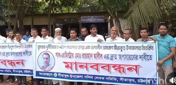 চট্টগ্রাম জেলার সীতাকুণ্ড উপজেলা সাব -রেজিস্ট্রার রায়হান হাবিবকে অপসারণে দুই দিনের সময় বেধে দিয়েছে উপজেলায় কর্মরত দলিল লেখকগণ। অন্যথায় তারা অনির্দিষ্টকালের কলম বিরতিতে যাওয়ার ঘোষণা দেন। ২১ অক্টোবর সোমবার দুপুর ১২ টায় চট্টগ্রামের সীতাকুণ্ড উপজেলা সাব-রেজিস্ট্রার অফিসের সামনে সীতাকুণ্ড উপজেলা দলিল লেখক সমিতির উদ্যোগে সীতাকুন্ডের সাব -রেজিস্ট্রার রায়হান হাবিবকে অপসারণে দাবিতে এক মানববন্ধন অনুষ্ঠিত হয়।