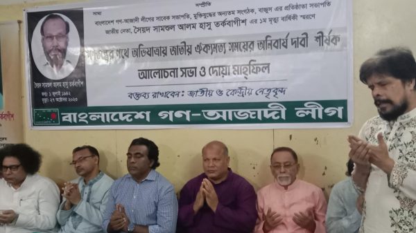 বাংলাদেশ গণ আজাদী লীগের সাবেক বিপ্লবী সভাপতি ও বর্ষিয়ান রাজনীতিবিদ মরহুম জননেতা সৈয়দ শামসুল আলম হাসু তর্কবাগীশ এর ১ম মৃত্যু বার্ষিকী স্মরণে আলোচনা সভা ও দোয়ার মাহফিলে ২৬ অক্টোবর ২০২৪ শনিবার বিকেল ৪.০০ ঘটিকায়, শাহবাগ সংস্কৃতি বিকাশ কেন্দ্র মিলনায়তনে সংগঠন এর সভাপতি মুহাম্মদ আতা উল্লাহ খান এর সভাপতিত্বে অনুষ্ঠিত হয়।